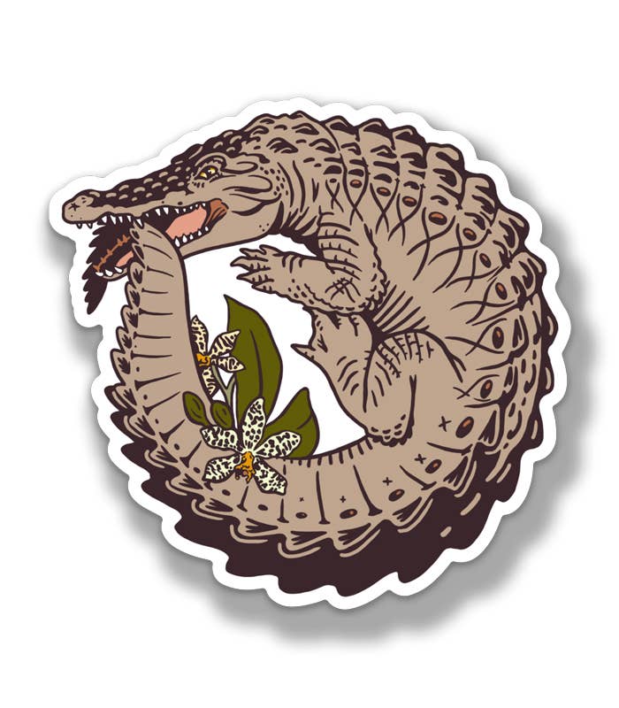 The oldest known Ouroboros appeared in the tomb of King Tut from the 13th century BC & since being added to the Freehand lineup of Goods in 2019, it's appeared as an American Alligator, Florida Panther & now as the American Crocodile & Florida Dollar Orchid. The literal Greek meaning of Ouroboros is "tail devourer" but we hope it means "everlasting" in the case of these two endangered species. Original art by Veronica Steiner. Thick, durable vinyl protects this sticker from scratches, water & sunlight. Matte finish. Sticker Size: 4" x 3.9".